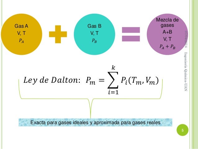 LEY DE DALTON: Dalton encontró que una mezcla de gases a temperatura y volúmenes definidos, la presión total es igual a la suma de las presiones parciales, esto significa que cada gas ejerce una presión. A la mezcla igual a la que ejercería si estuviese solo en el mismo volumen.